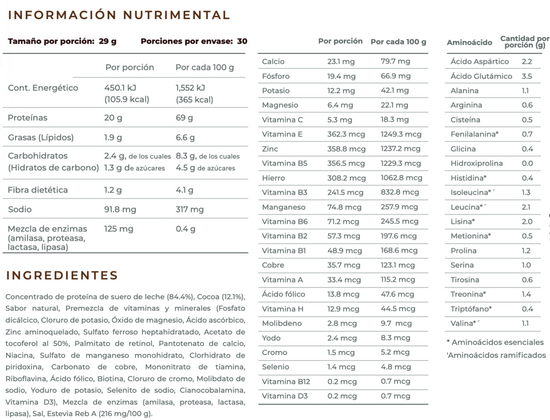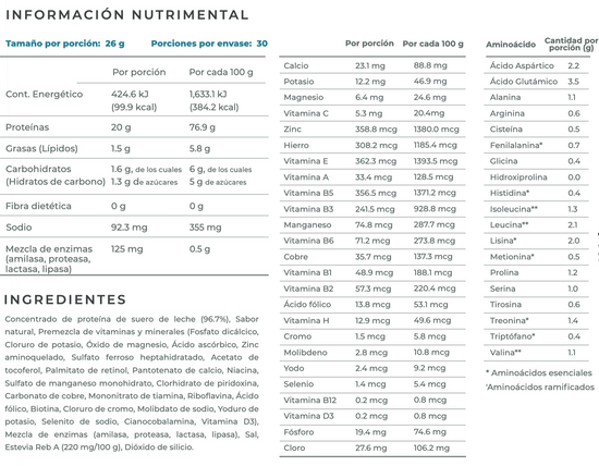 Está elaborada con proteína de suero de leche de la más alta calidad. 20 gramos de proteína de suero de leche por porción Adicionada con vitaminas y minerales Sabores 100% naturales. Rinde 30 porciones Con aminoácidos esenciales Sin azúcares añadidos Sin rellenos Sin azúcar o celulosa Sin fibras Vainilla: Con 96,7% de proteína de suero de leche de la más alta calidad. Chocolate: con 84.4% de pura proteína de leche de la más alta calidad. Sabor 100% sabores naturales y deliciosos. Funciona con el plan alimenticio Keto.
